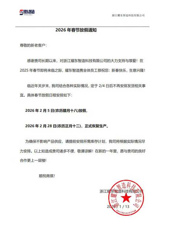 بر اساس این اطلاعیه، به منظور اطمینان از کیفیت محصول و تحویل منظم سفارشهای قبل از تعطیلات، خطوط تولید تولید هوشمند ژجیانگ یائودونگ از 5 فوریه 2025 به طور کامل تعطیل میشود. همزمان، محمولههای لجستیکی نیز در تعطیلات جشنواره بهار به حالت تعلیق در خواهند آمد. این شرکت به کلیه مشتریان جدید و فعلی که دارای موجودی یا سفارش مورد نیاز هستند، عاجل توصیه می کند که از آخرین فرصت فرصت استفاده کرده و سفارشات و تاییدیه های خود را در اسرع وقت تکمیل کنند. این شرکت را قادر می سازد تا منابع را به طور موثر مدیریت کند و از تحویل به موقع و با کیفیت دسته نهایی محصولات قبل از تعطیلات اطمینان حاصل کند.